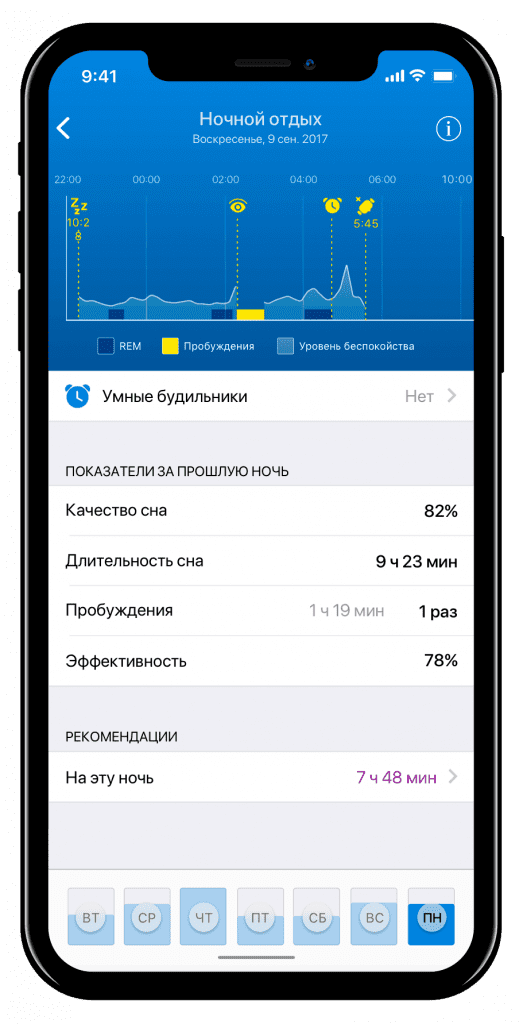 Каждую ночь HEALBE GoBe анализирует параметры вашего сна, чтобы предоставить полный отчет: в приложении вы увидите временную шкалу с циклами REM- и Non-REM-фаз. С помощью этой информации можно определить глубину и качество вашего сна, а также моменты пробуждения.