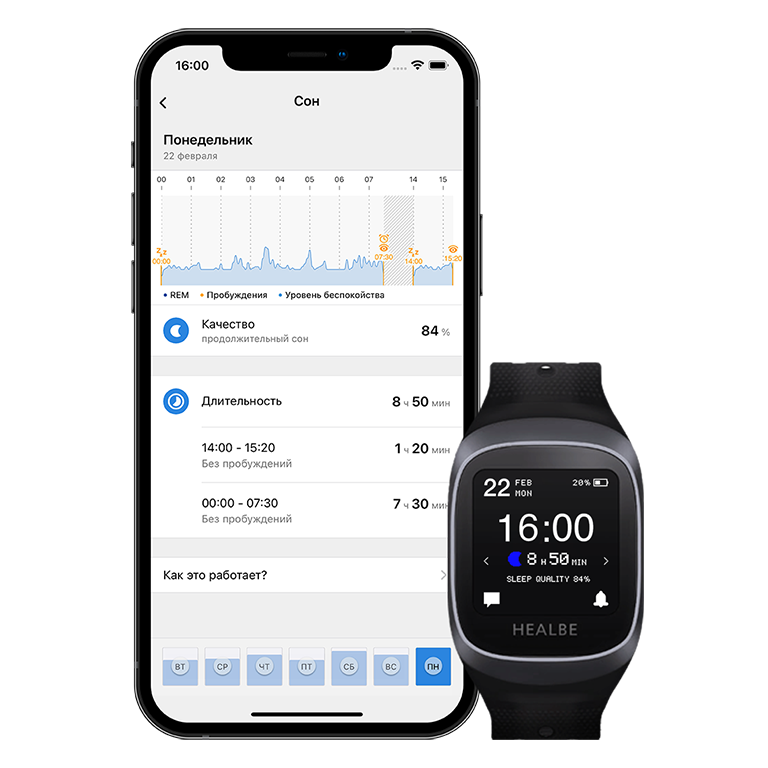 GoBe рассчитывает Качество вашего сна каждую ночь, основываясь на времени сна за сутки, Пульсе и уровне Беспокойства. Это надёжный показатель того, как хорошо восстанавливаются ресурсы вашего тела, и, если вы видите, что Качество сна регулярно ниже 60% — стоит уделить больше внимания отдыху.
