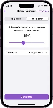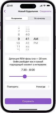 Со временем пробуждения разобрались — если проснуться после REM-фазы, это получится сделать легче всего. Но ведь не всегда нужно куда-то спешить и заставлять организм прерывать сон. В этом случае поможет будильник GoBe, который опирается только на качество сна. С будильником по качеству вы сможете настроить свой режим таким образом, чтобы всегда отдыхать хорошо. Постоянные 8 часов сна — это хорошо, но есть и переработки, стресс, ночные смены, да и простое желание «отоспаться» на выходных. Будильник по качеству подойдёт для всех случаев, когда вы точно знаете, что время есть, и нужно просто дать организму восстановиться.