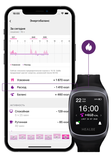 С помощью технологии FLOW™ GoBe собирает и анализирует информацию, полученную с датчиков устройства, и рассчитывает количество потраченных калорий. Используя акселерометр, GoBe измеряет интенсивность ваших движений в течение дня, а также считает шаги и пройденную дистанцию.