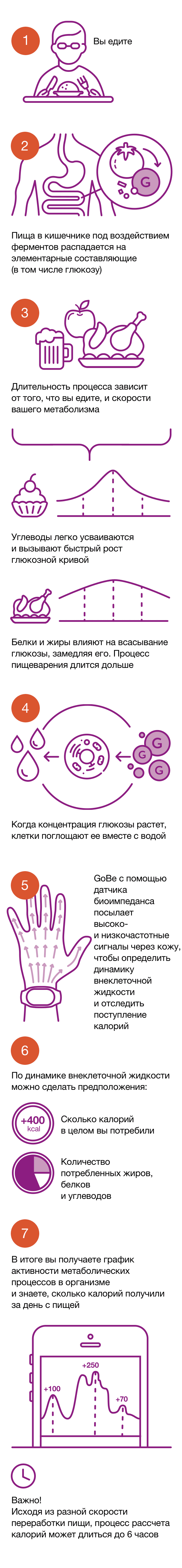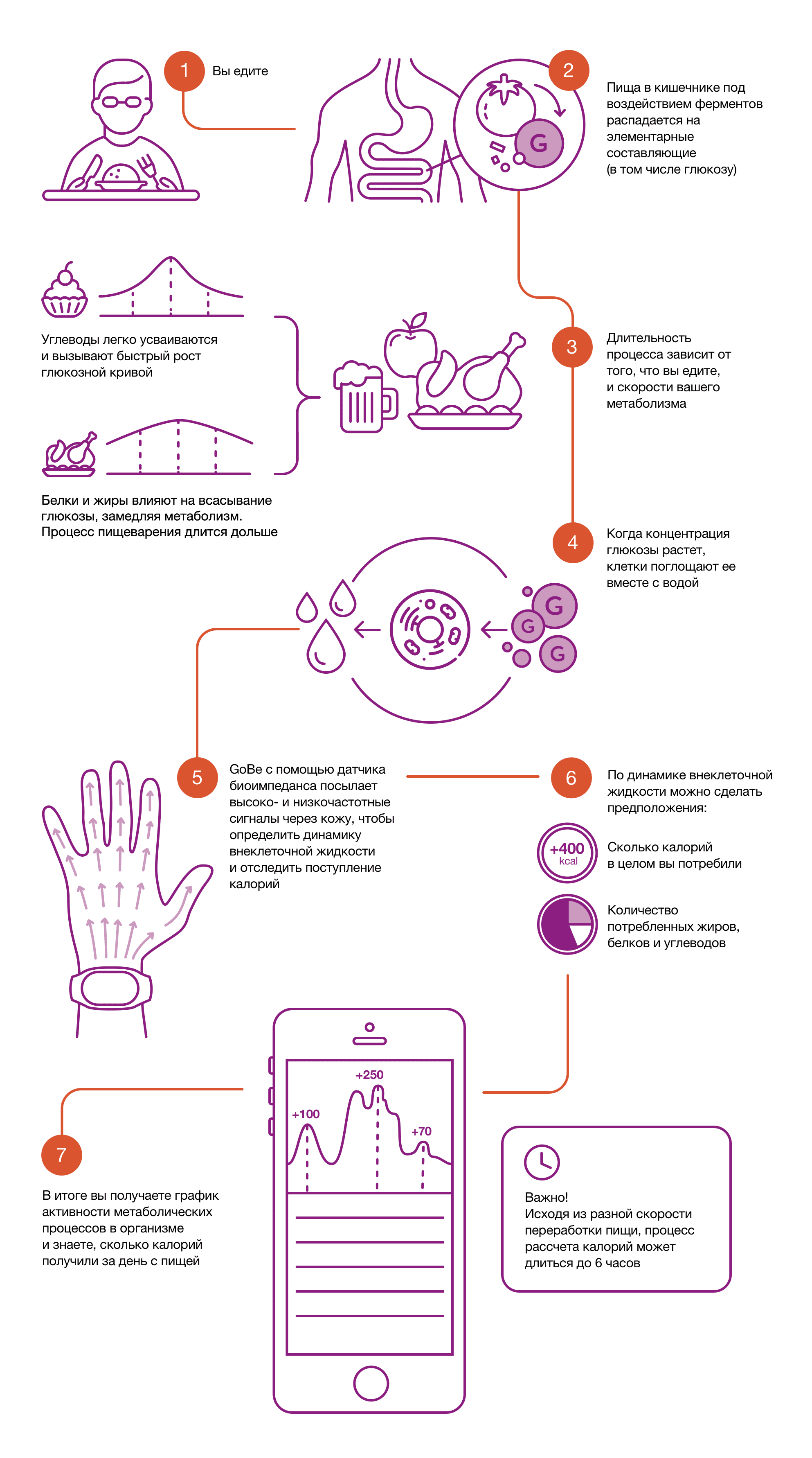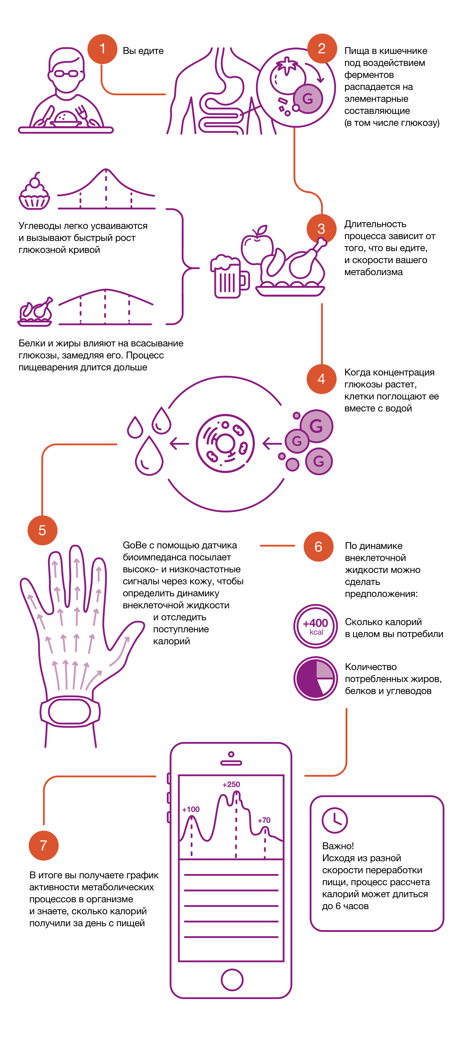 Запатентованная технология FLOW™ комбинирует данные трех сенсоров (акселерометр, датчик биоимпеданса и пьезосенсор) для наиболее точного подсчета. После того, как вы поели, инсулин проникает в клетку, вытесняя воду. GoBe оценивает динамику изменения внеклеточной жидкости и использует эту информацию, чтобы подсчитать усвоенные калории.