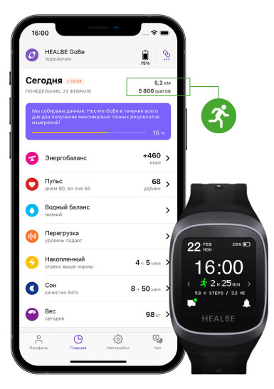 HEALBE GoBe подсчитывает, сколько калорий ваше тело усваивает с пищей, контролирует водный баланс организма, считает пульс и следит за качеством сна. C умным браслетом вы сможете анализировать изменения своего тела, развить осознанное отношение к питанию, сбросить вес и оставаться в форме!