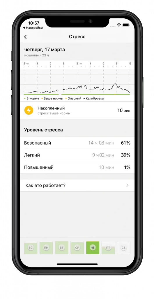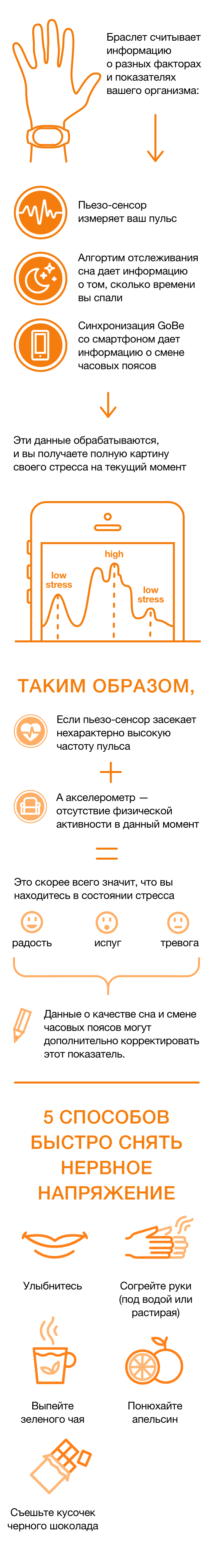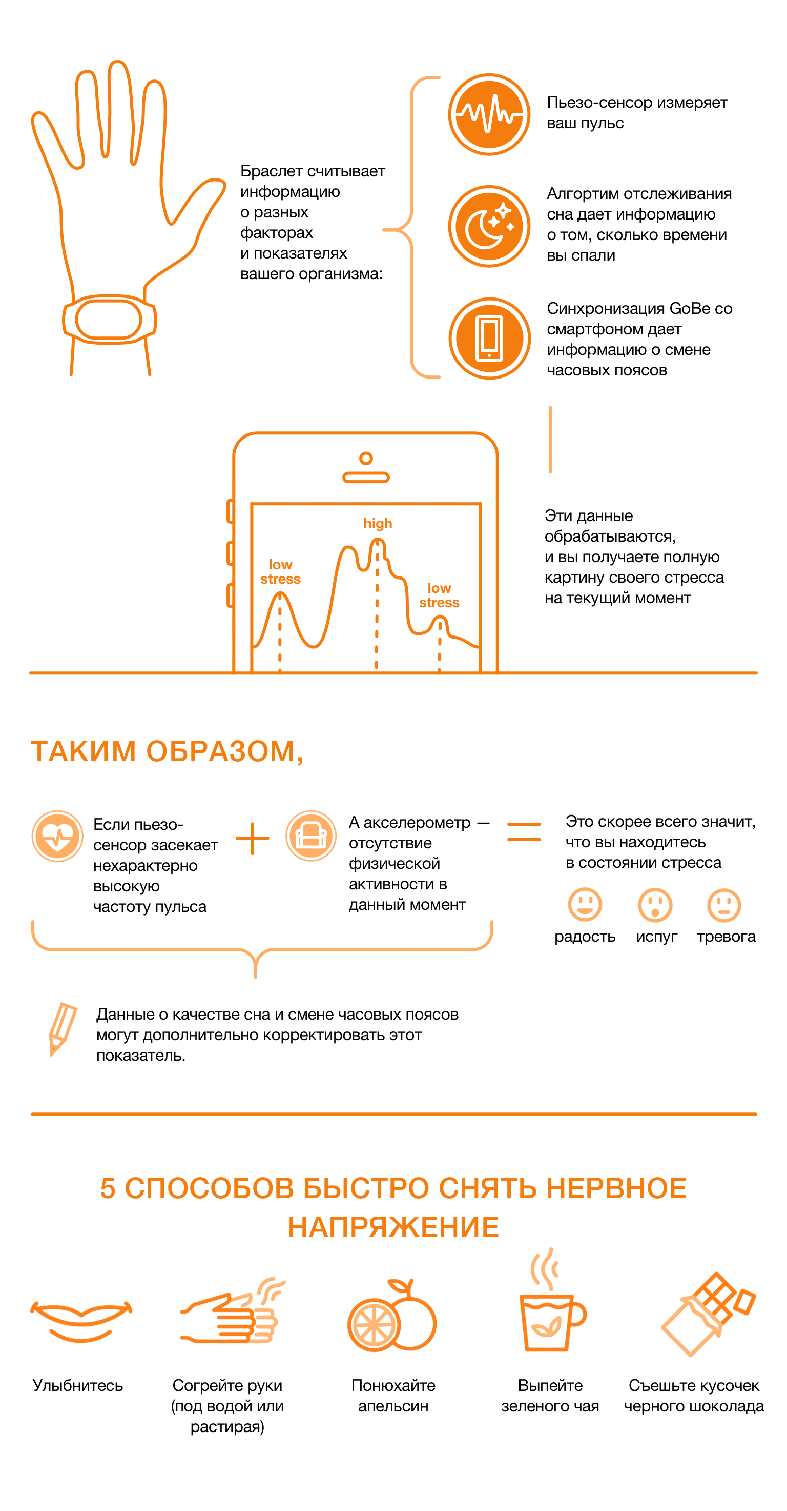 Браслет HEALBE GoBe рассчитывает ваш уровень стресса каждый час, проверяя сердечный пульс в данный момент и в течение дня, а также данные о качестве сна за предыдущую ночь и смене часовых поясов. На графике в приложении вы сможете отслеживать ваш уровень стресса за последние 24 часа. HEALBE GoBe использует шкалу из 5 уровней стресса, где 1 уровень обозначает отсутствие стресса и 5 уровень говорит об очень высоком уровне стресса.